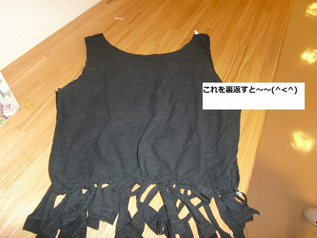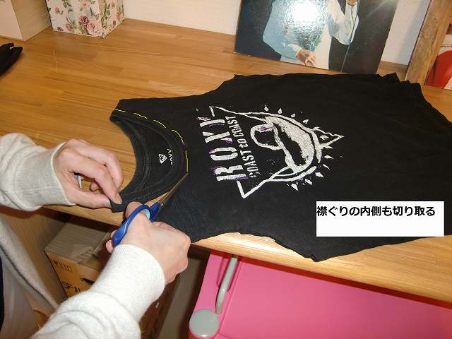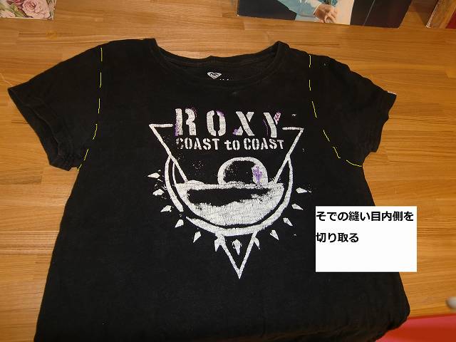 ③襟ぐりの内側も大胆に黄色い線のように切る!! ②と③でエコバックの持ち手になりますので、形を考えて。