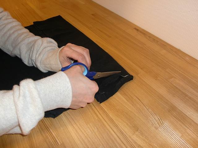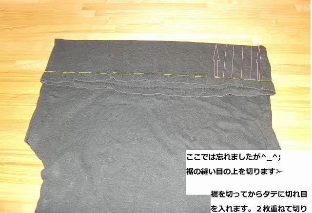 ⑤ここでは切るのを忘れましたが、裾の縫い目の上を横に切る(黄色い線の様に)