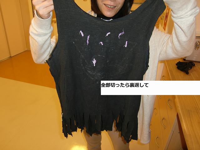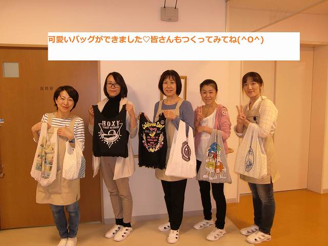 今年はみんなで 『Tシャツをリメイクした縫わずに出来るエコバック』 を作ることにしました。