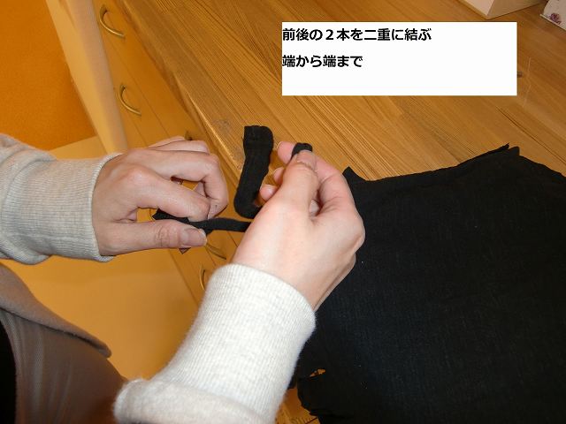 ⑧切込みを入れた上下2本を端から結ぶ(二重結びで)端まで全部結ぶ