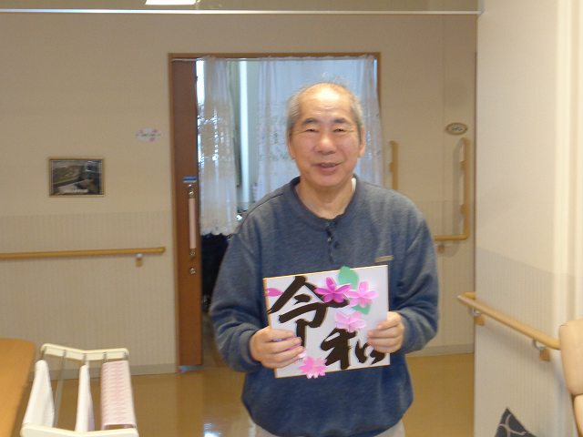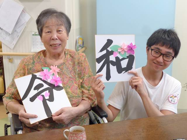 発表の時入居者様とテレビの前でスタンバイして発表されると「令和かい。」「いいね。」と話され色紙が出来ると