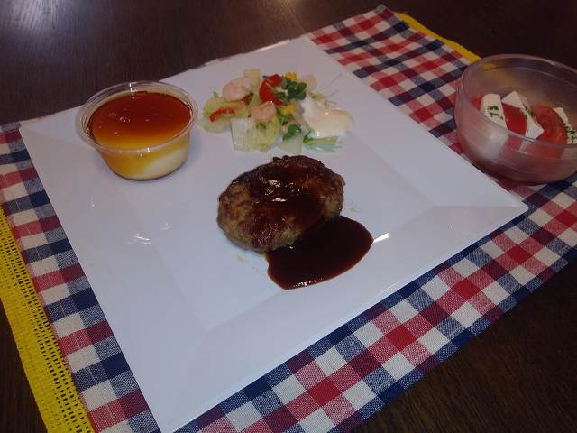 ハンバーグ、トマトと豆腐の和風カプレーゼ、彩りサラダ、