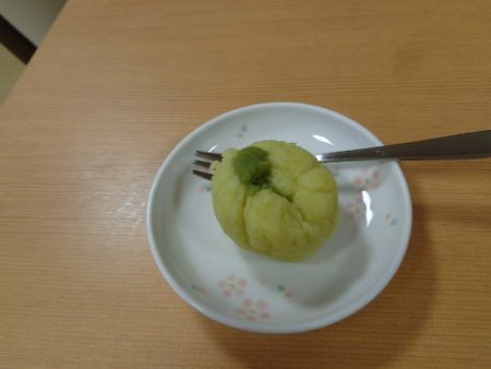 皆さんで試食会!抹茶の苦味とサツマイモの甘みが