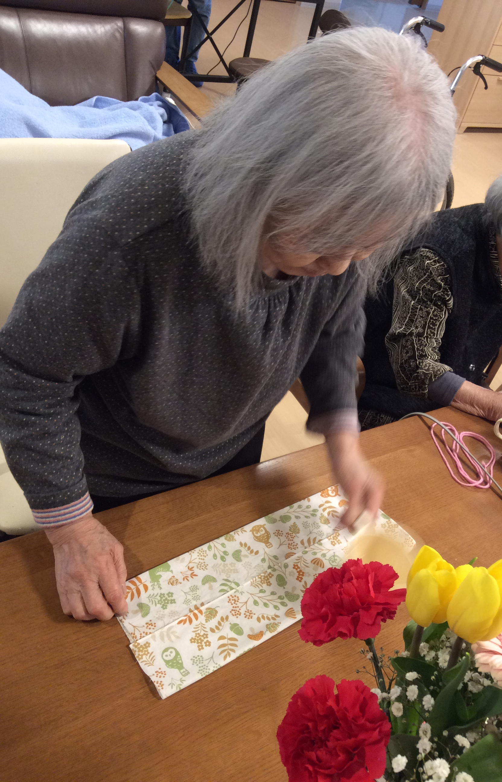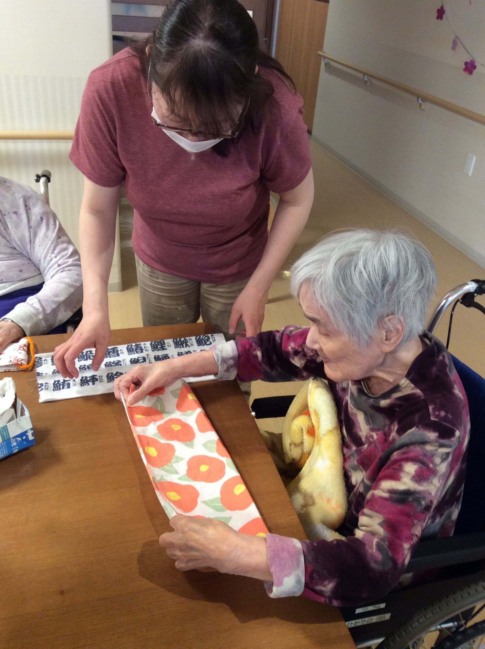 さてマスクがどこにも売っていないという事で、ショートステイでは利用者の皆様で手作りマスクに挑戦してみました。