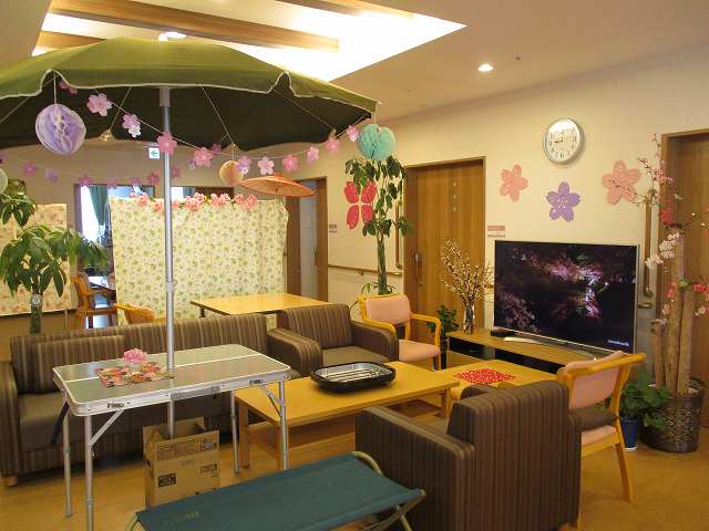 ユニット内で桜の装飾、キャップテーブルなどで野外の雰囲気を演出して皆さんで焼肉を楽しみました♪