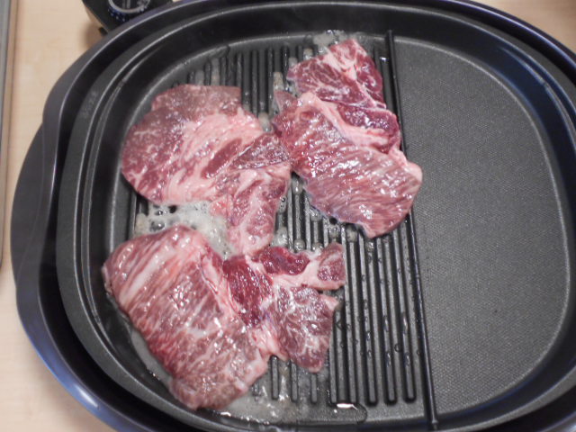 せっかくなら目の前で焼いて、音や匂いも楽しんでいただきましょう!ということで、ホットプレート2台とお肉をユニットに持ち込みました。