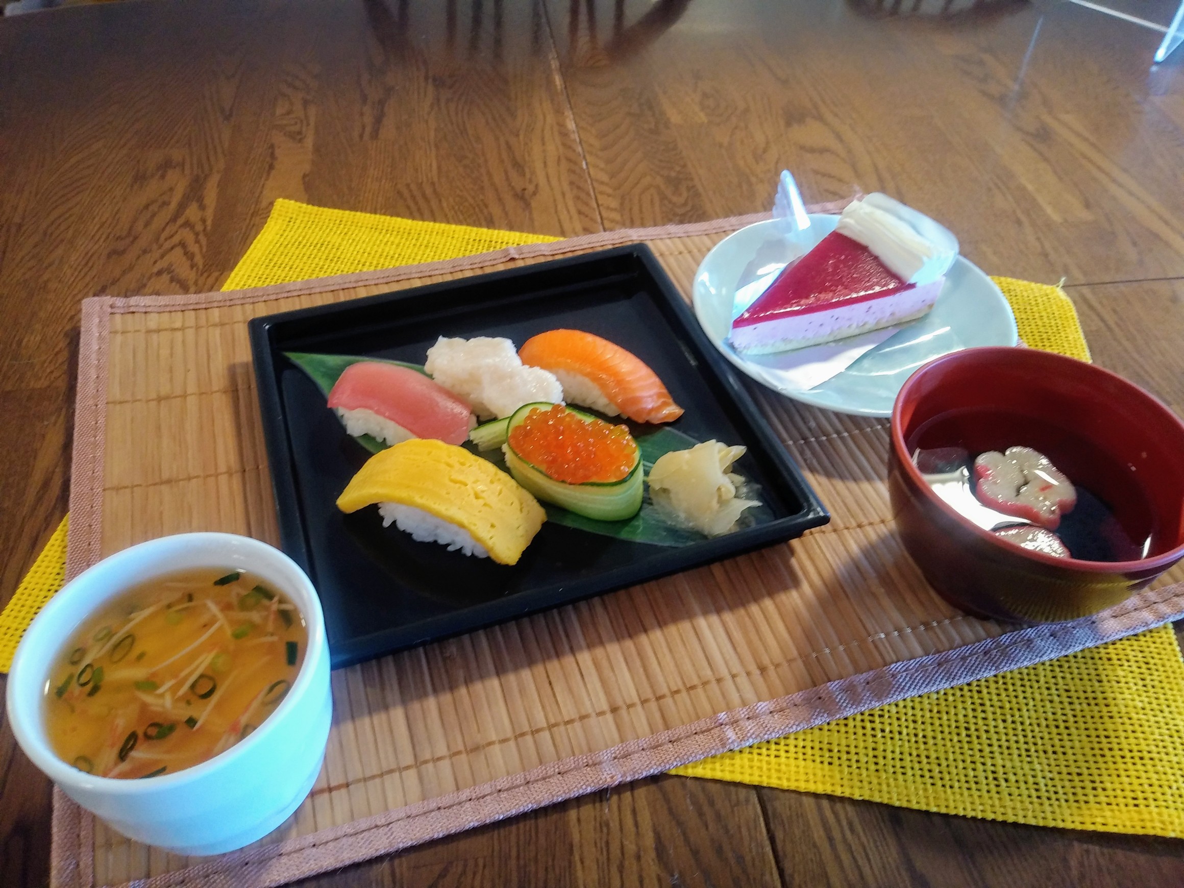 お寿司盛合せ、すまし汁、あんかけ茶碗蒸し、デザート(ケーキ) です♡