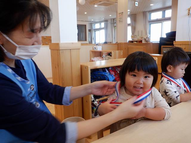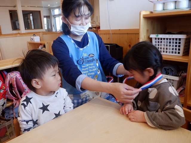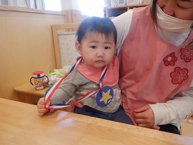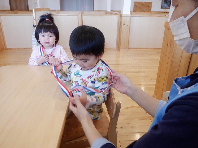 新入園児は、初めておうちの方々と離れ不安な気持ちの中でしたが、メダルを首にかけてもらい、嬉しそうな表情や不思議そうな表情を見せてくれました。