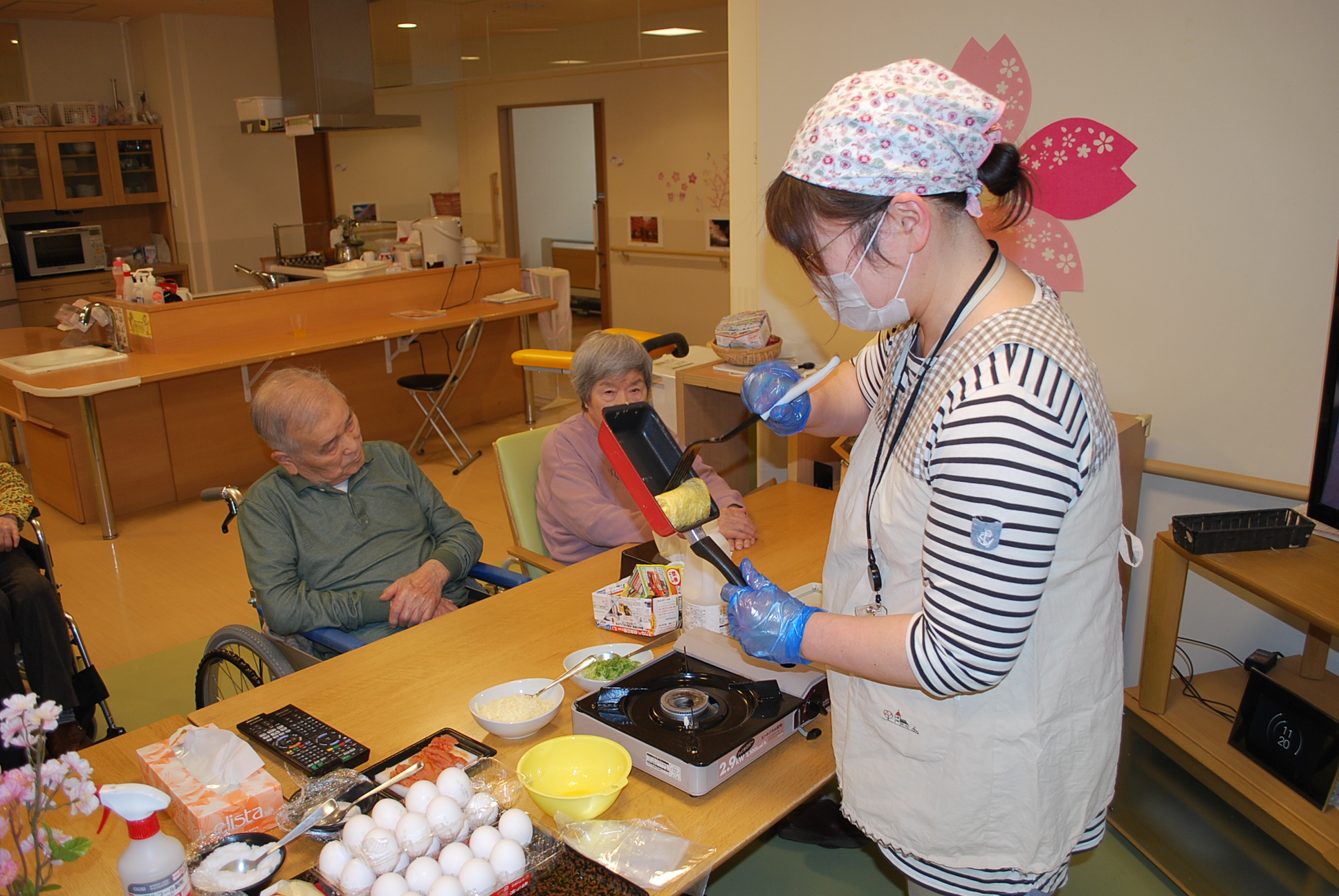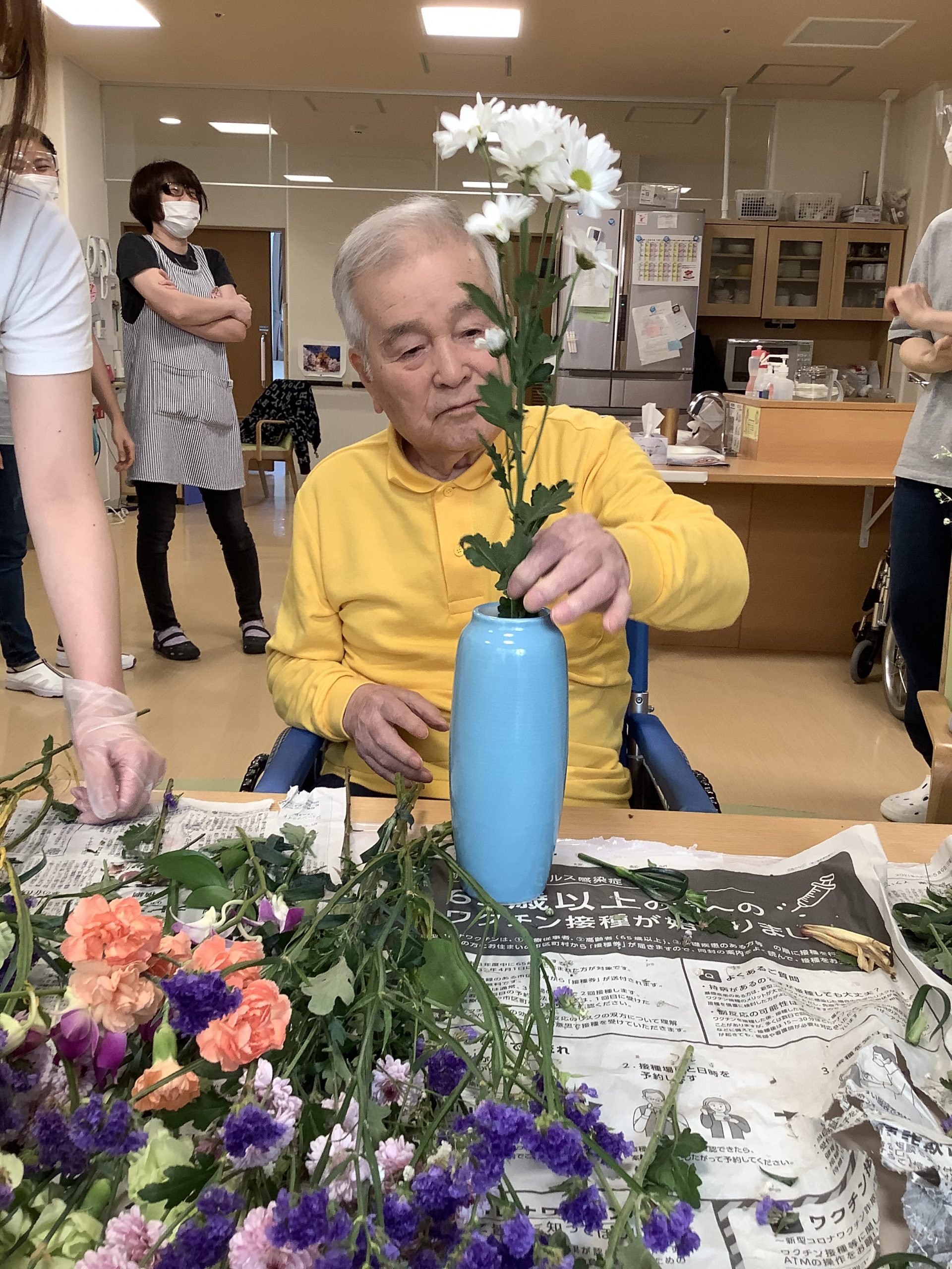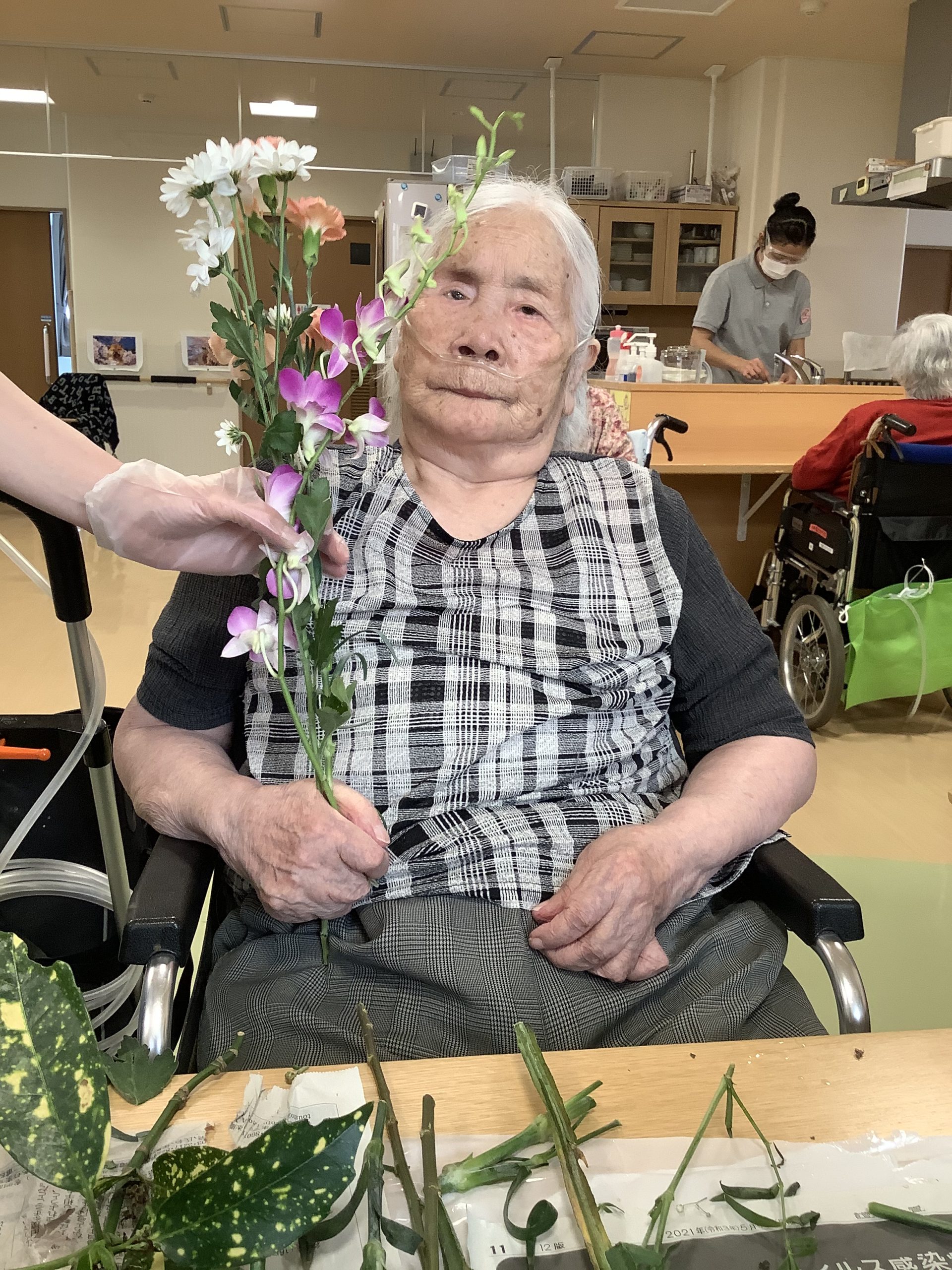 まだコロナウイルスが落ち着かず外出は出来ないですが、入居者様に少しでも楽しい気持ちになって欲しくて玉子焼きレクとフラワーアレンジメントを開催しました