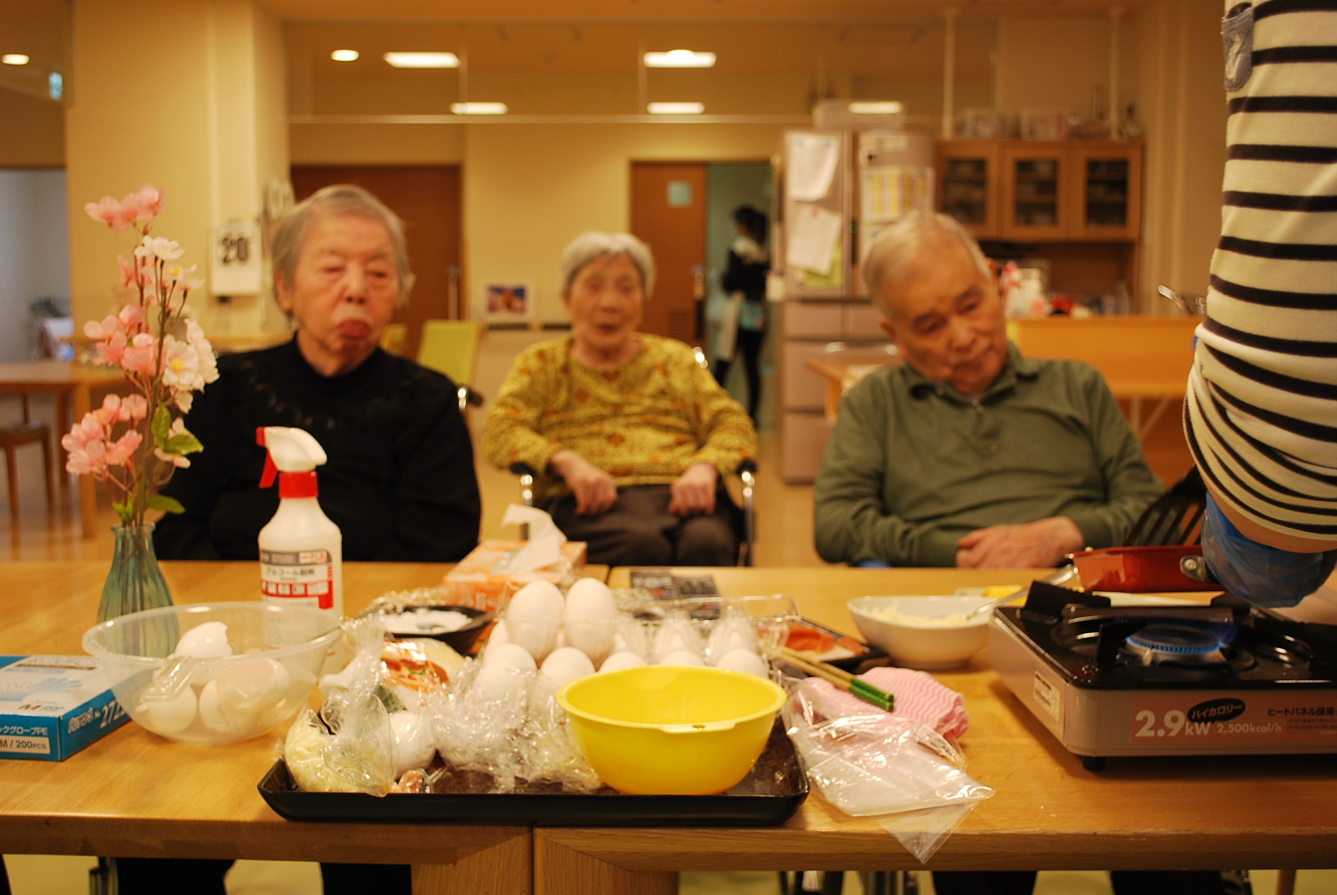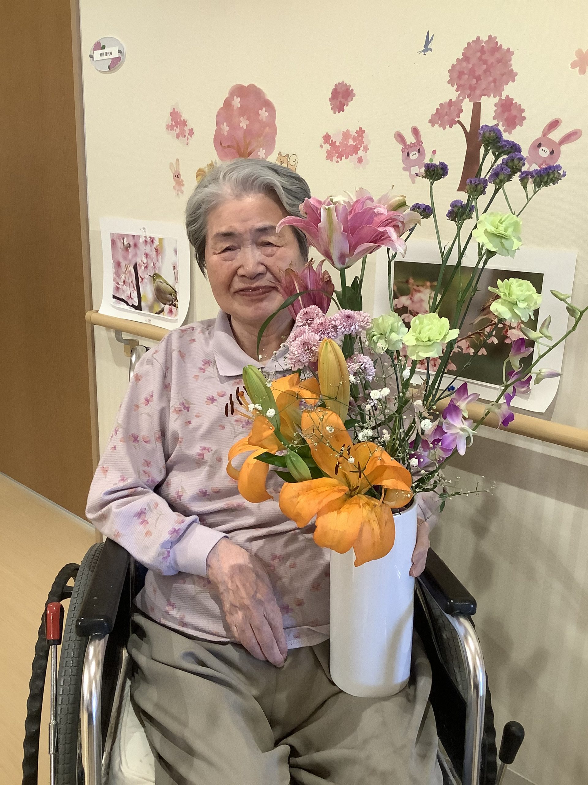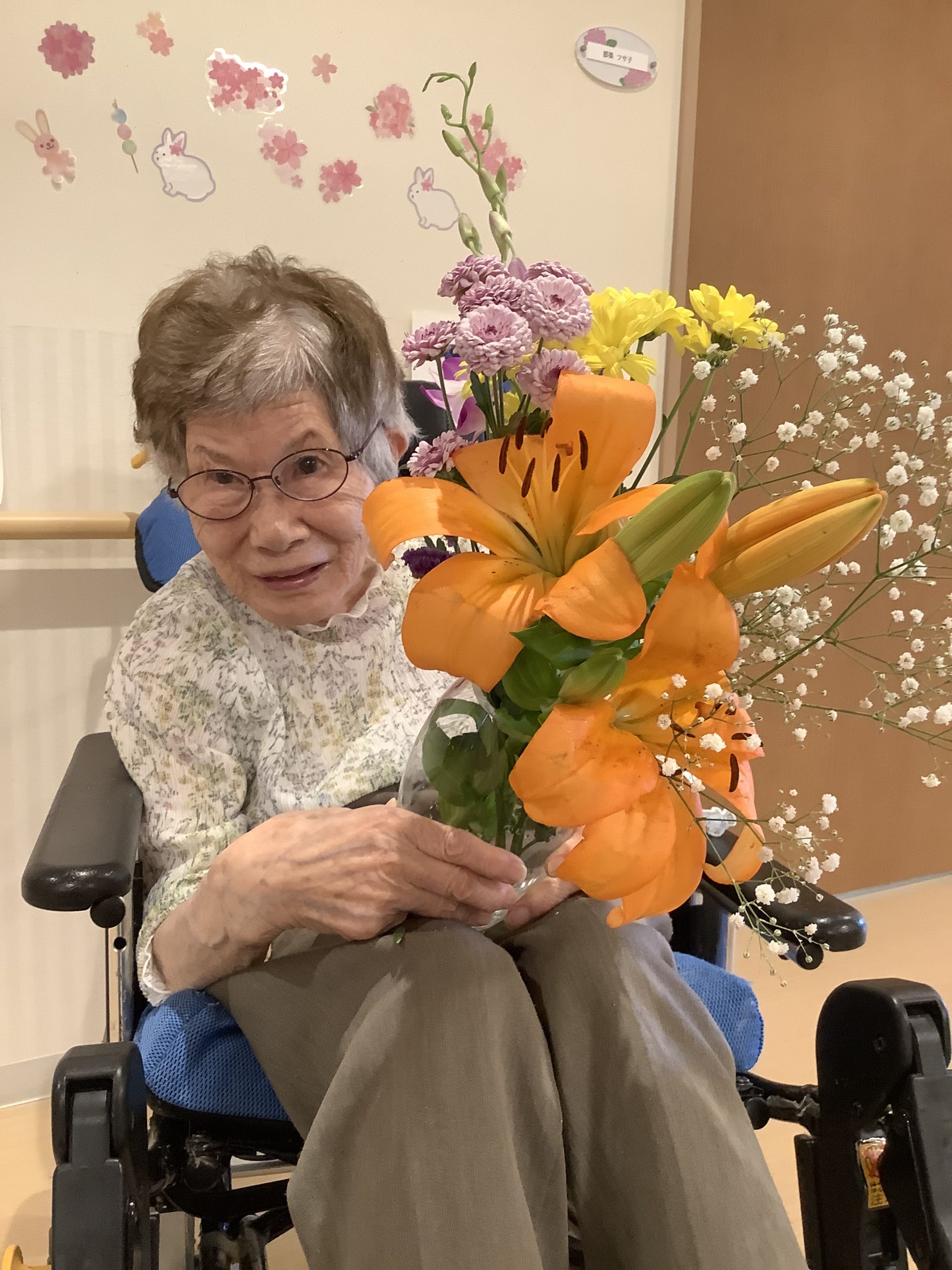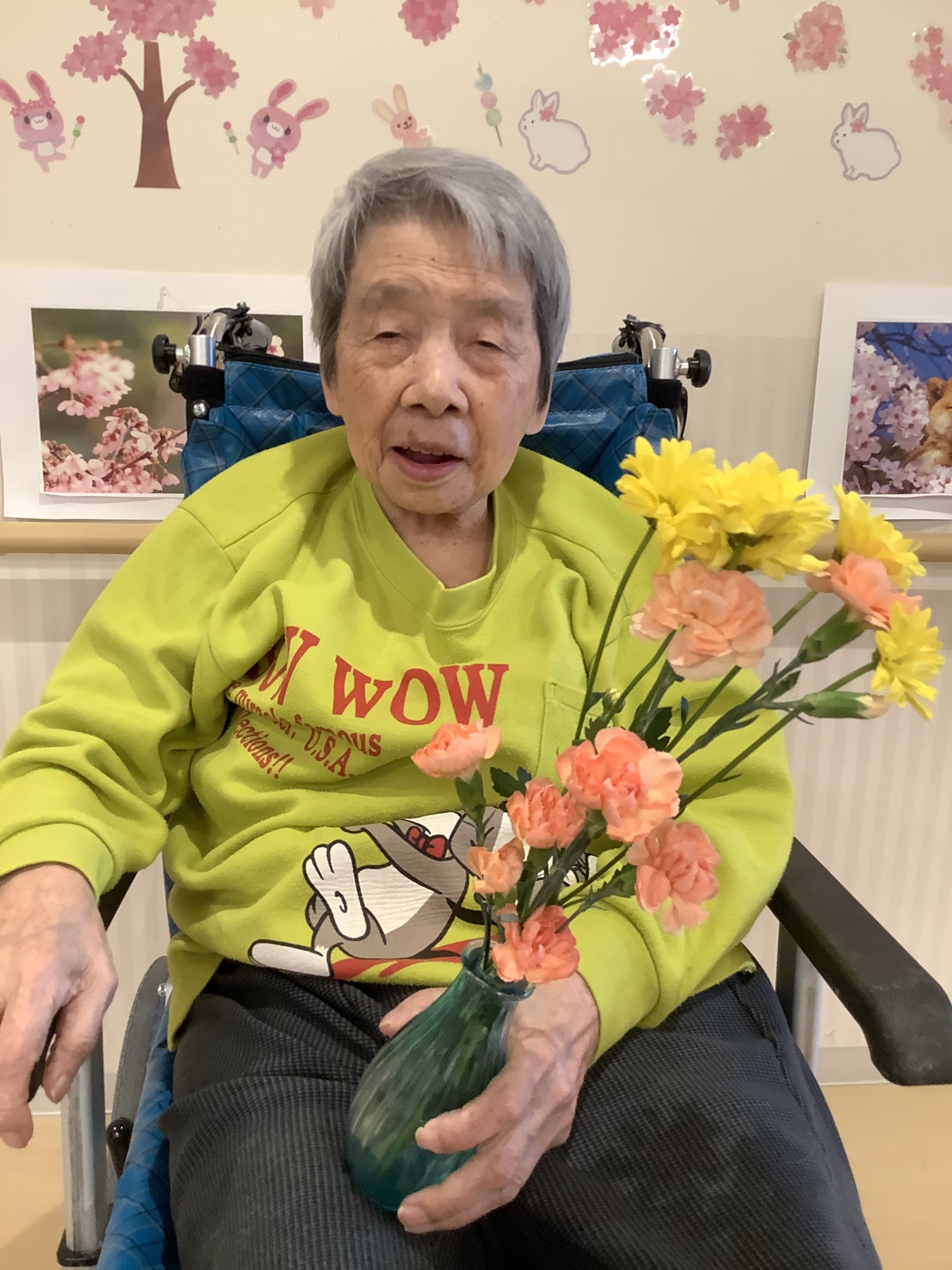 まだコロナウイルスが落ち着かず外出は出来ないですが、入居者様に少しでも楽しい気持ちになって欲しくて玉子焼きレクとフラワーアレンジメントを開催しました