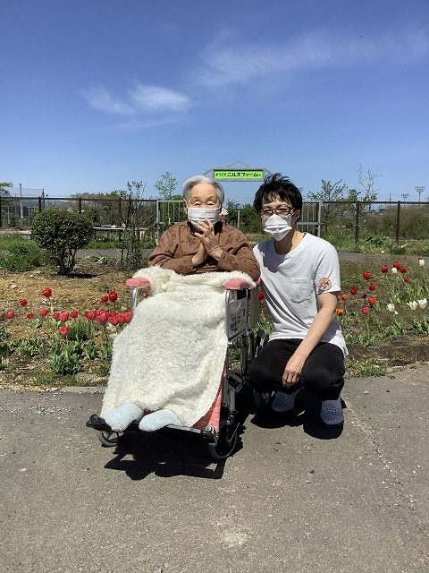 やっと”ぽかぽか陽気”になり施設裏の公園の芝が鮮やかな緑になり、ひかりの花壇も