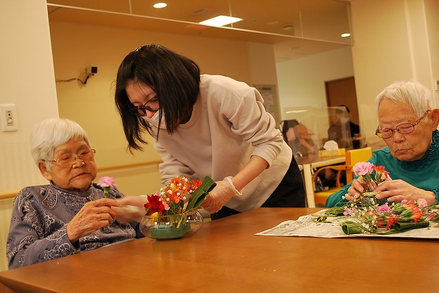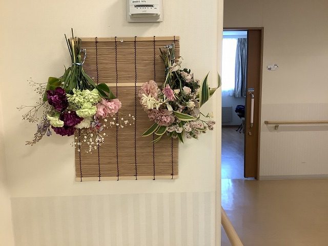 皆様に季節、香り、色彩を感じて頂くためにフラワーアレンジメントレクを行いました。