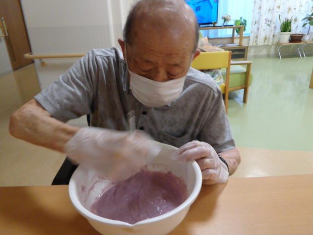 一生懸命にかき混ぜすぎて疲れてしまわれた入居者様もいましたが、何か達成感なのか満足されていました![]()