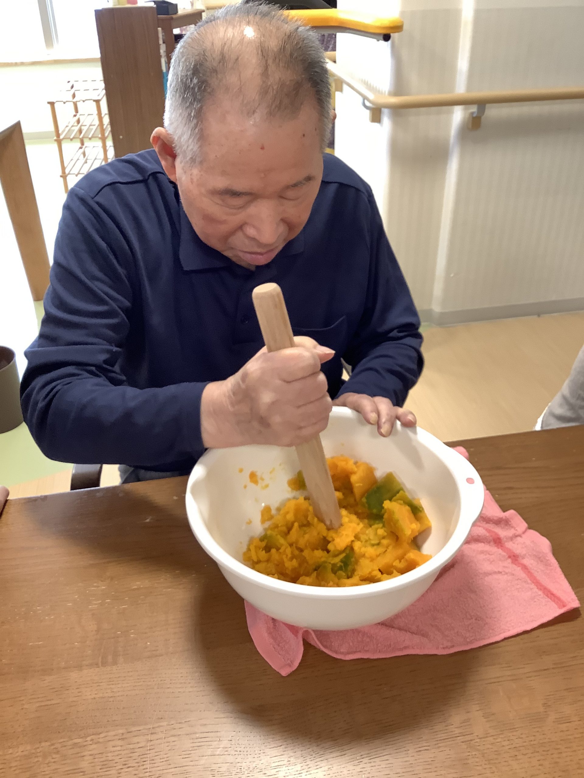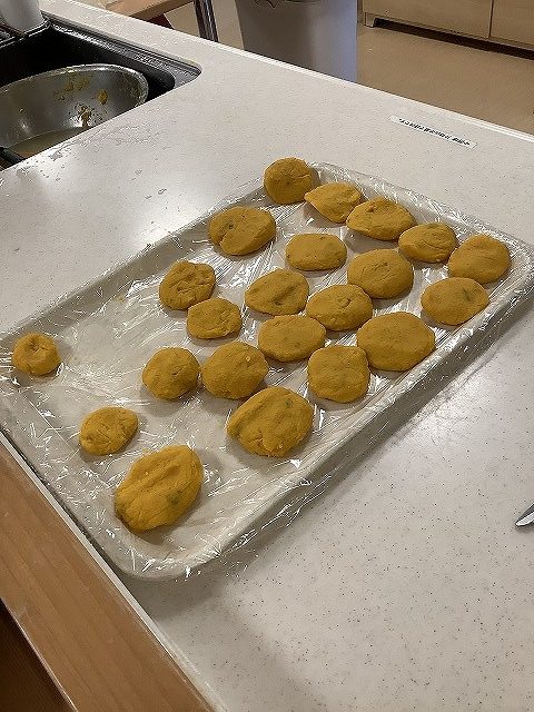 カボチャを蒸かしボールで潰し・・・・・団子作り開始です。 まるめて・まるめて・かたちをととのえて!